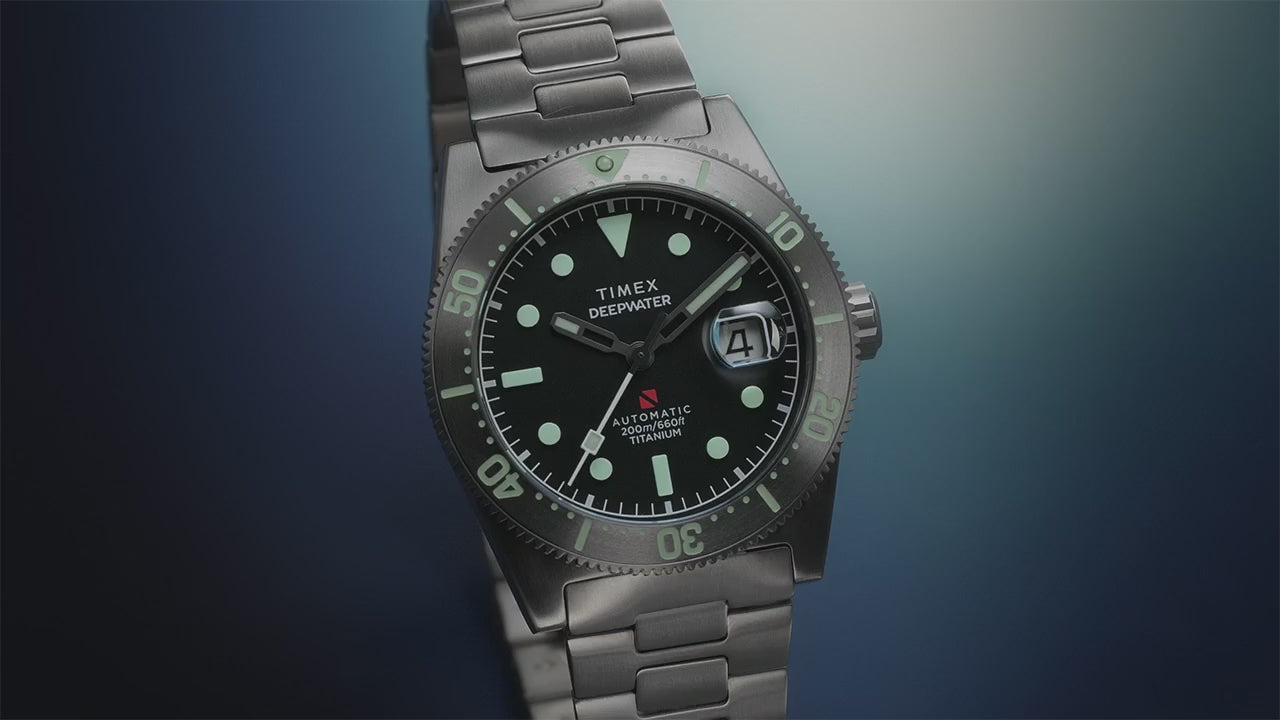 Timex Deepwater Reef 200 Titanium combines rugged professional-grade performance with feather-light comfort. The 41 mm case and fully brushed Grade 2 titanium bracelet deliver a strength-to-weight ratio unmatched by steel, while the 13 mm height keeps the watch slim on the wrist. A unidirectional ratcheting bezel, screw-down crown and case back, and 200 m water resistance support serious underwater exploration. The black dial features Super-Luminova® on hands, markers and bezel, with a date magnifier at 3 o'clock and a scratch-resistant sapphire crystal with anti-reflective coating. Fitted with a Miyota 8215 21-jewel automatic movement (40-hour power reserve) and a butterfly deployant clasp. Suitable as a men's watch or as a refined diver's companion for any wrist.